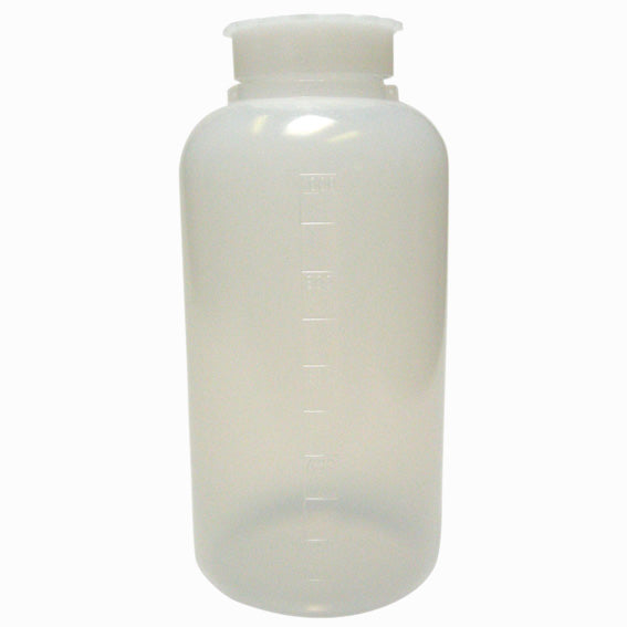 In polyethylene, graduated, with inner cap. The wide neck facilitates operations of filling and emptying the bottles. Provided with tagging or sealing hole. Suitable for foodstuff.