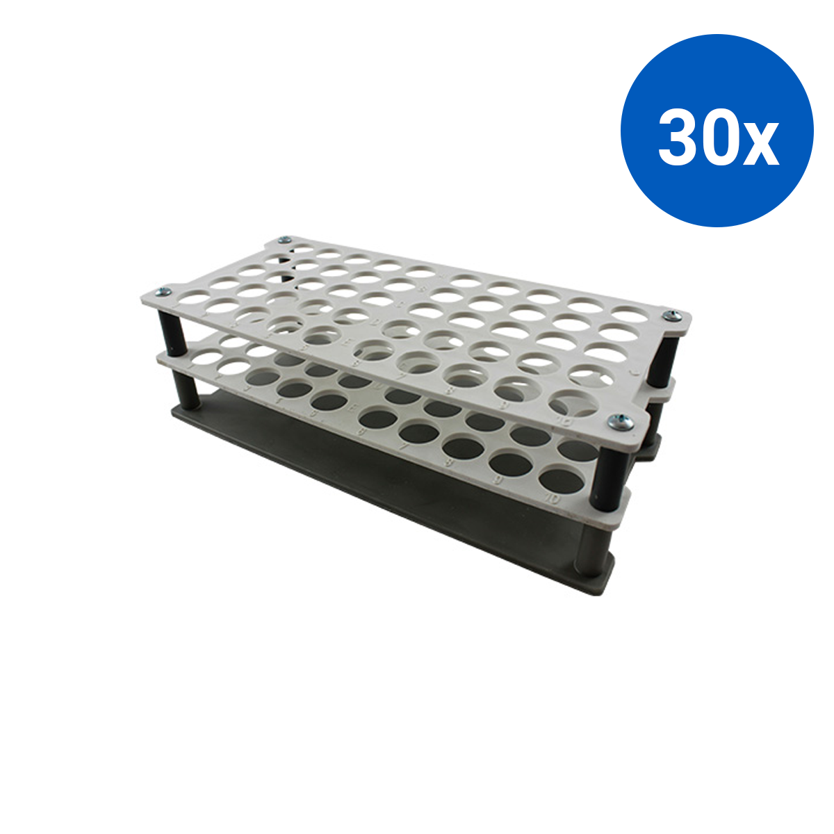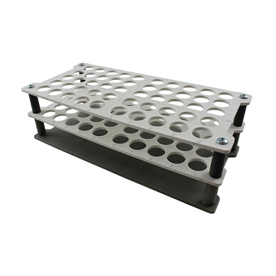 In polypropylene, autoclavable, stackable. Dimensions: 235 x 110 x 75 mm. An alphanumeric embrossed grid allows a precise position identification of test tubes.