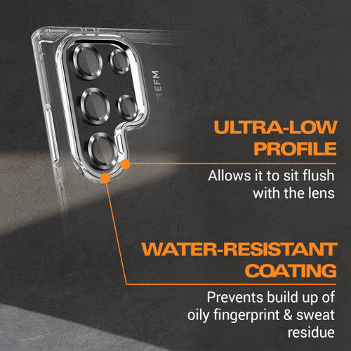 EFM Camera Lens Armour Samsung Galaxy S24 Ultra - Carbon is made from aviation aluminium and 9H hardness tempered glass, ensuring your camera lens is protected from sharp impact and fingerprints, sweat, and grease residues. The nano-waterproof coating layer keeps your camera looking good as new. Plus, the extra thin design means you won't even notice it's there.
