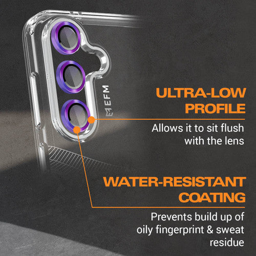 EFM Camera Lens Armour Samsung Galaxy S24+ Plus - Rainbow Nirvana is made from aviation aluminium and 9H hardness tempered glass, ensuring your camera lens is protected from sharp impact and fingerprints, sweat, and grease residues. The nano-waterproof coating layer keeps your camera looking good as new. Plus, the extra thin design means you won't even notice it's there.