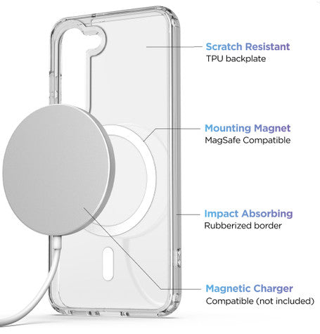 A premium transparent case crafted with attention to detail. Encased Clear Magsafe Case Samsung Galaxy S23+ Plus - Clear brings together the best of both worlds with serious drop protection wrapped in a sleek premium design. The transparent case provides high quality reliable protection and is designed with a reinforced frame and lining to withstand both impact and abrasion. Built-in magnets offer compatibility with the world of MagSafe chargers, mounts, wallets, and accessories.