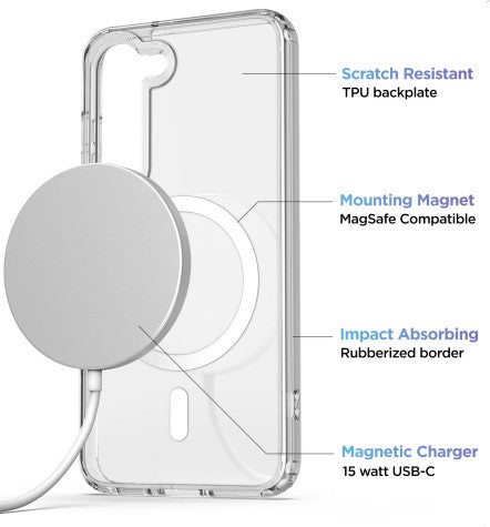 A premium case, crafted with attention to detail. Encased Clear MagSafe Case Samsung Galaxy S23+ Plus with Portable MagSafe Charger - Clear brings together the best of both worlds with serious drop protection wrapped in a sleek premium design. The case provides high quality reliable protection and is designed with a reinforced frame and lining to withstand both impact and abrasion.