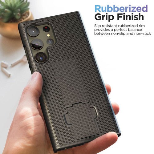 Encased Duraclip Case Samsung Galaxy S23 Ultra with Belt Clip Holster - Black is an ultra-slim belt case compatible with Samsung Galaxy S23 Ultra that is built with attention to detail, featuring a solid-core polycarbonate frame and non-slip rubberized grip finish. Inside the holster, a soft microfiber lining adds protection for the inward-facing screen while the holster keeps your phone conveniently at your side.