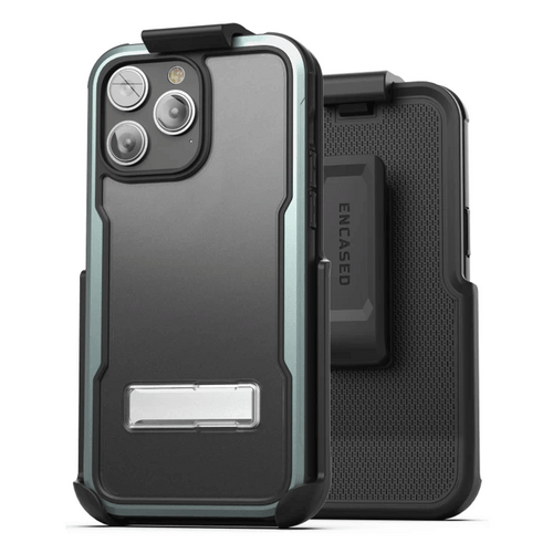 Safeguard your iPhone 14 Pro Max with the aluminum Encased Exos Armor Case iPhone 14 Pro Max with Belt Clip Holster - Gunmetal.