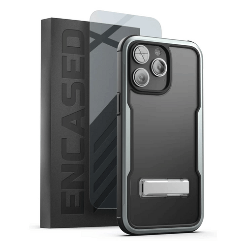 Elevate your iPhone 14 Pro Max with our new Aluminum Case + Kickstand and HD TEMPERED GLASS Encased Exos Armor Case with Screen Protector iPhone 14 Pro Max - Gunmetal, providing full 360 protection for your device.