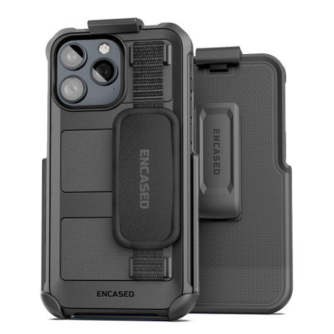 Encased Falcon Case iPhone 15 Pro with Hand Strap and Belt Clip Holster - Black