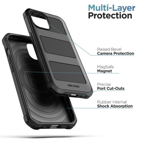Your phone’s ultimate armor against the unexpected. Tested to withstand 10-foot drops, Encased Falcon MagSafe Case iPhone 15 with Belt Clip Holster - Black is tough enough to handle anything life throws at it. It's rugged design and shock-absorbing lining provide unbeatable protection, while the raised lip safeguards your screen from impacts.