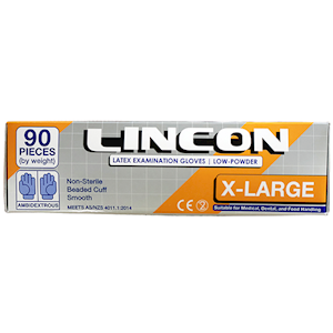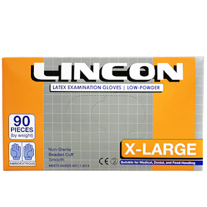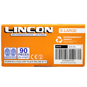 Lincon Extra Large Latex Examination Gloves are crafted from natural biodegradable latex for enhanced environmental sustainability without compromising quality. These low-powder gloves offer excellent tactile sensitivity and dexterity, making them ideal for food handling, healthcare, and laboratory settings. Featuring a beaded cuff for easy donning and a cream-colored finish, they are designed to reduce skin irritation with <60?g/g of water-extractable proteins. HACCP-certified and compliant with AS/NZS 4011:1997 standards, each box contains 90 gloves tailored for superior comfort and grip.
