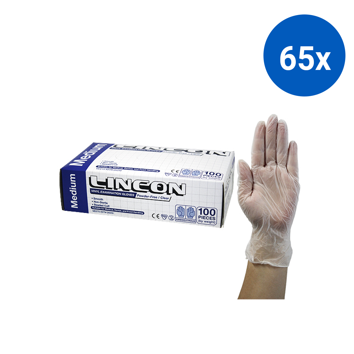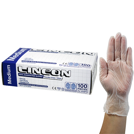 Lincon Vinyl Examination Gloves Recyclable Powder Free Medium 100/Box - Clear x65