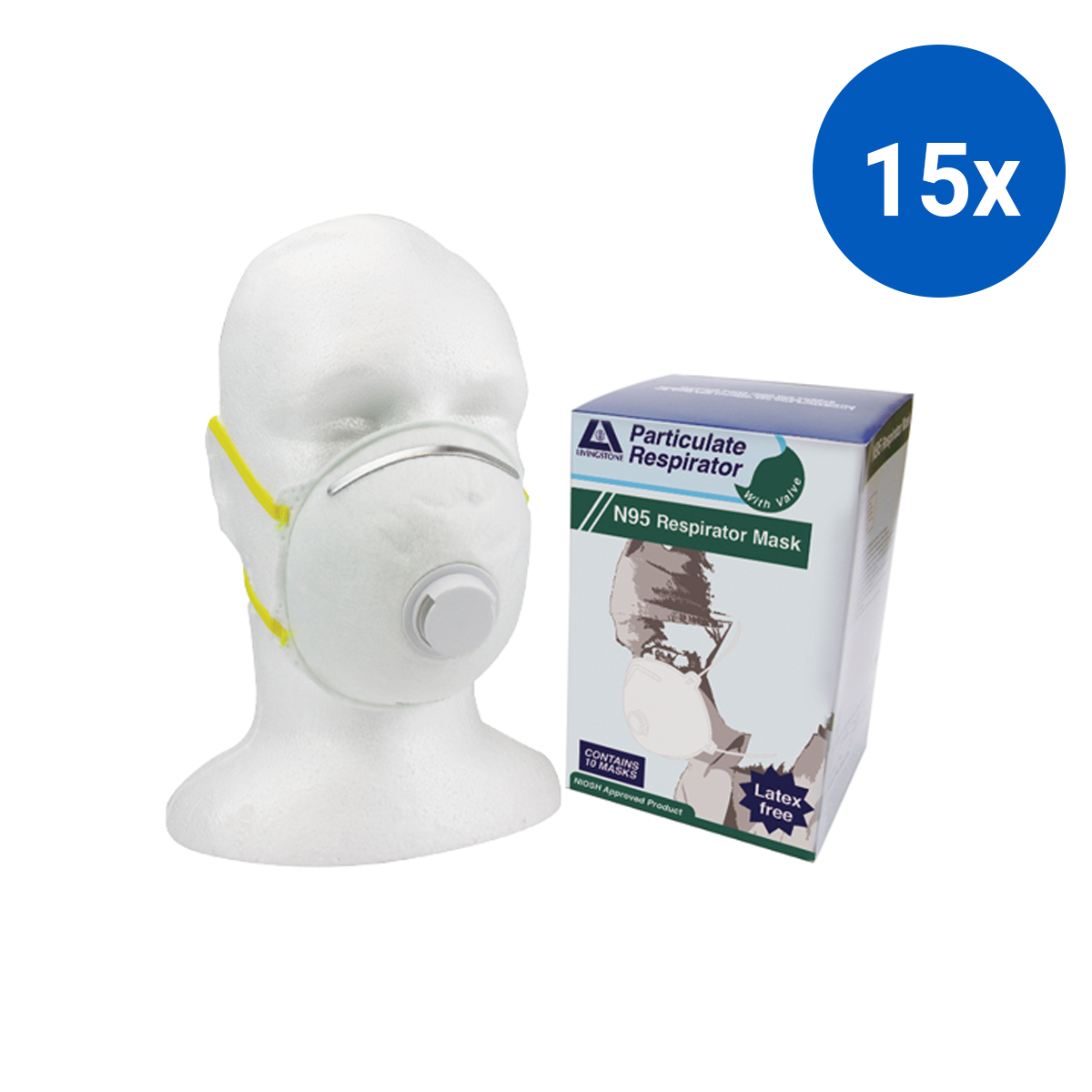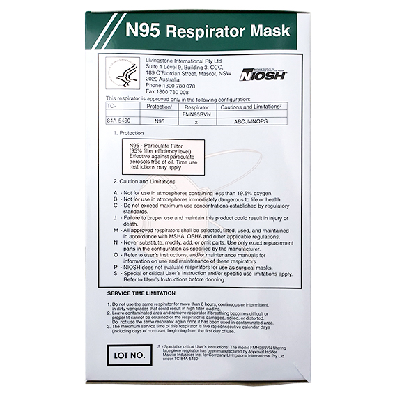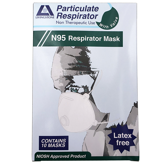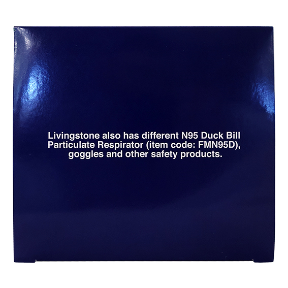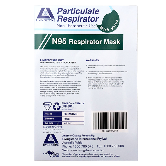 Livingstone N95 Respirator Masks are recommended for general protection. For Non-Therapeutic use. NIOSH, National Institute of Occupational Health, N95 standard is USA equivalent of the European P2 and P3 standard. Our masks are NIOSH approved and provides active protection through the Bacterial Filtration Efficiency (BFE) of 0.1 micron at over 95%. Filters out solid and liquid particles, excluding articles containing oils. Latex Free, will not cause any skin irritations. Mould-able nose piece for comfortable fit. The One-way valve design increases air flow for more comfortable breathing, and the polyurethane headbands allow for easy donning. Its BFE/PFE and Delta P have been fully tested by world renowned Nelson Laboratory in USA. Livingstone is probably the only Australian-owned company that undertakes expensive voluntary testing of compliance to AS4381, N95 and/or P2 for your protection and peace of mind.