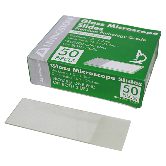 Small, flat, rectangular piece of glass on which specimens can be mounted for microscopic study. Feature half white glass, bevelled corners with ground edges. These slides have a frosted or enamel-coated area at one end, for labeling with a pencil or pen.