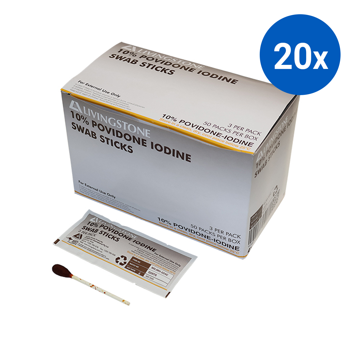 Livingstone 10% Povidone Iodine Cotton Swab on Applicator Sticks 3/Pack 50 Packs/Box - White x20