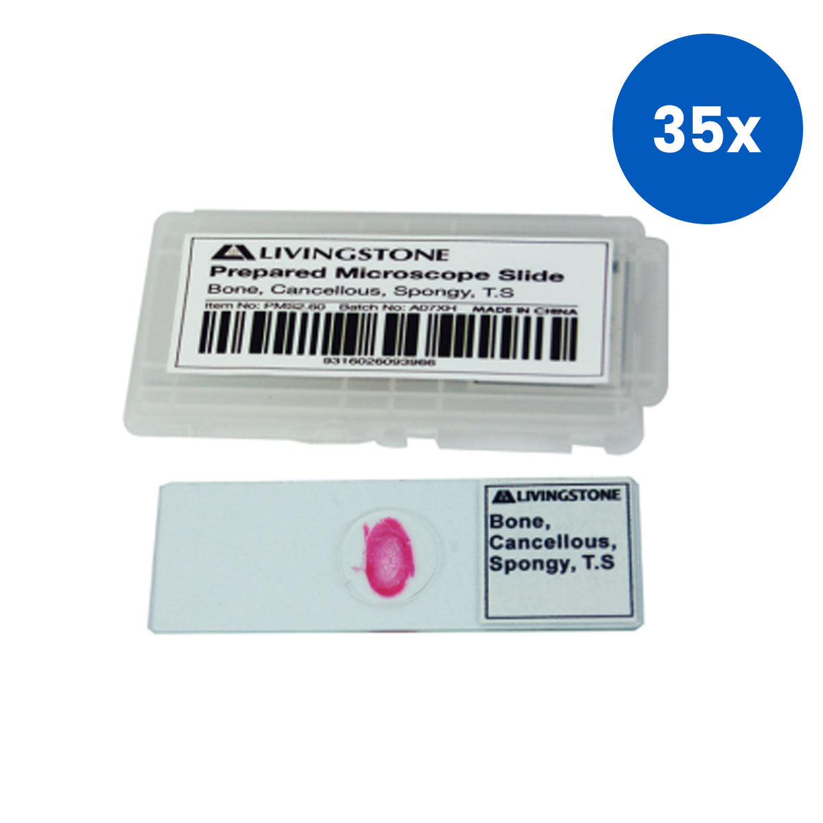 The Livingstone Basic Level Prepared Slide – Bone, Cancellous (Spongy), Transverse Section (Item No. PMS2.60) provides a detailed microscopic view of spongy bone tissue, ideal for foundational studies in anatomy, histology, and physiology. This slide highlights the porous structure of cancellous bone, including trabeculae and marrow spaces, allowing students to observe how lightweight bone architecture supports strength and flexibility in the human skeletal system.