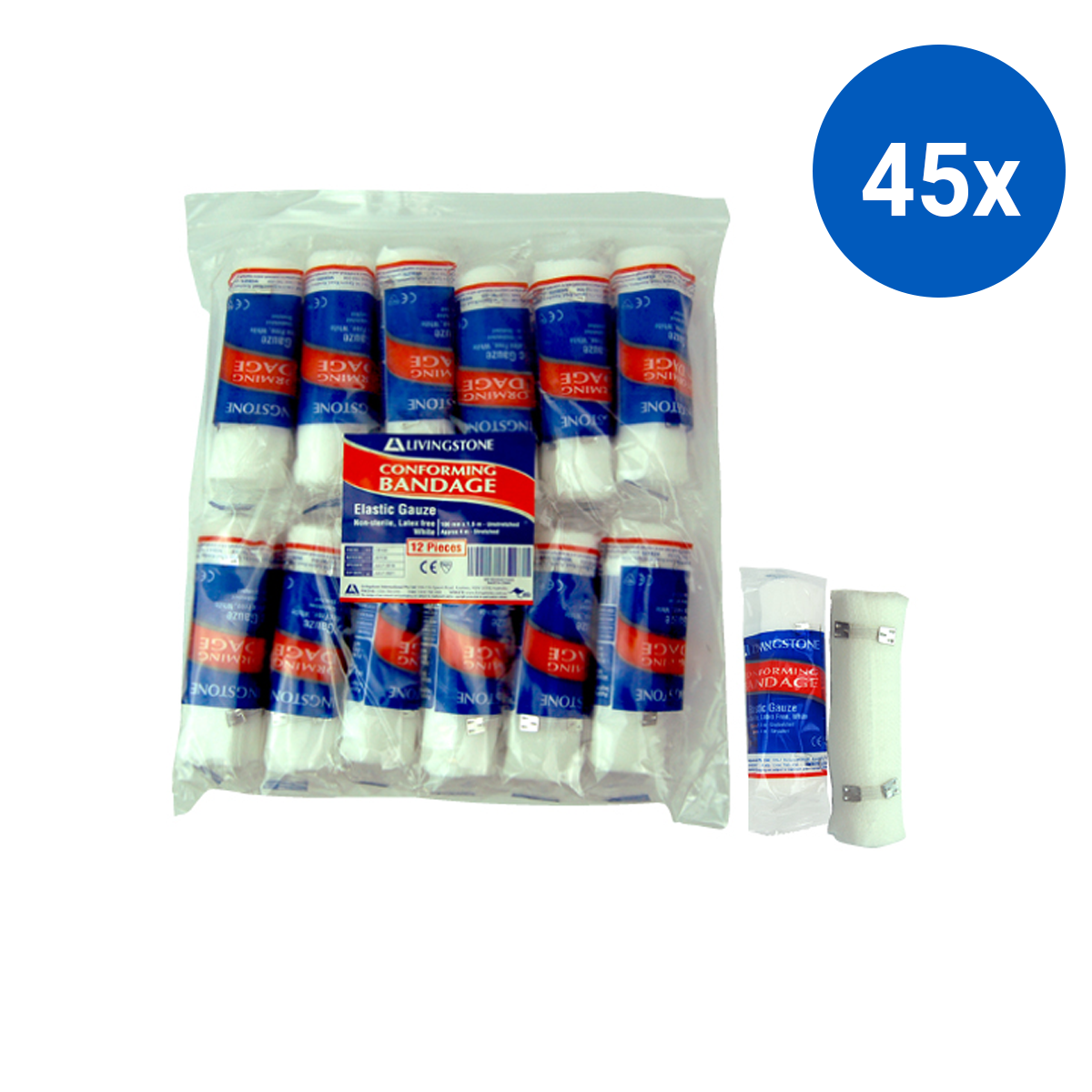Livingstone Conforming Bandage with Clips 100mm x 4m Stretched 12/Pack - White x45