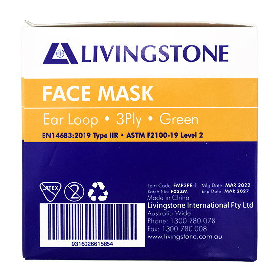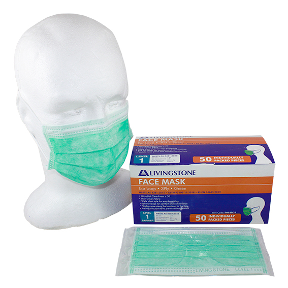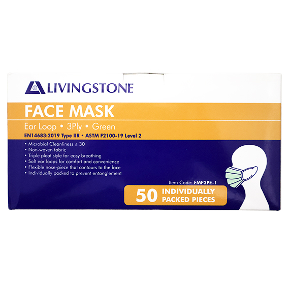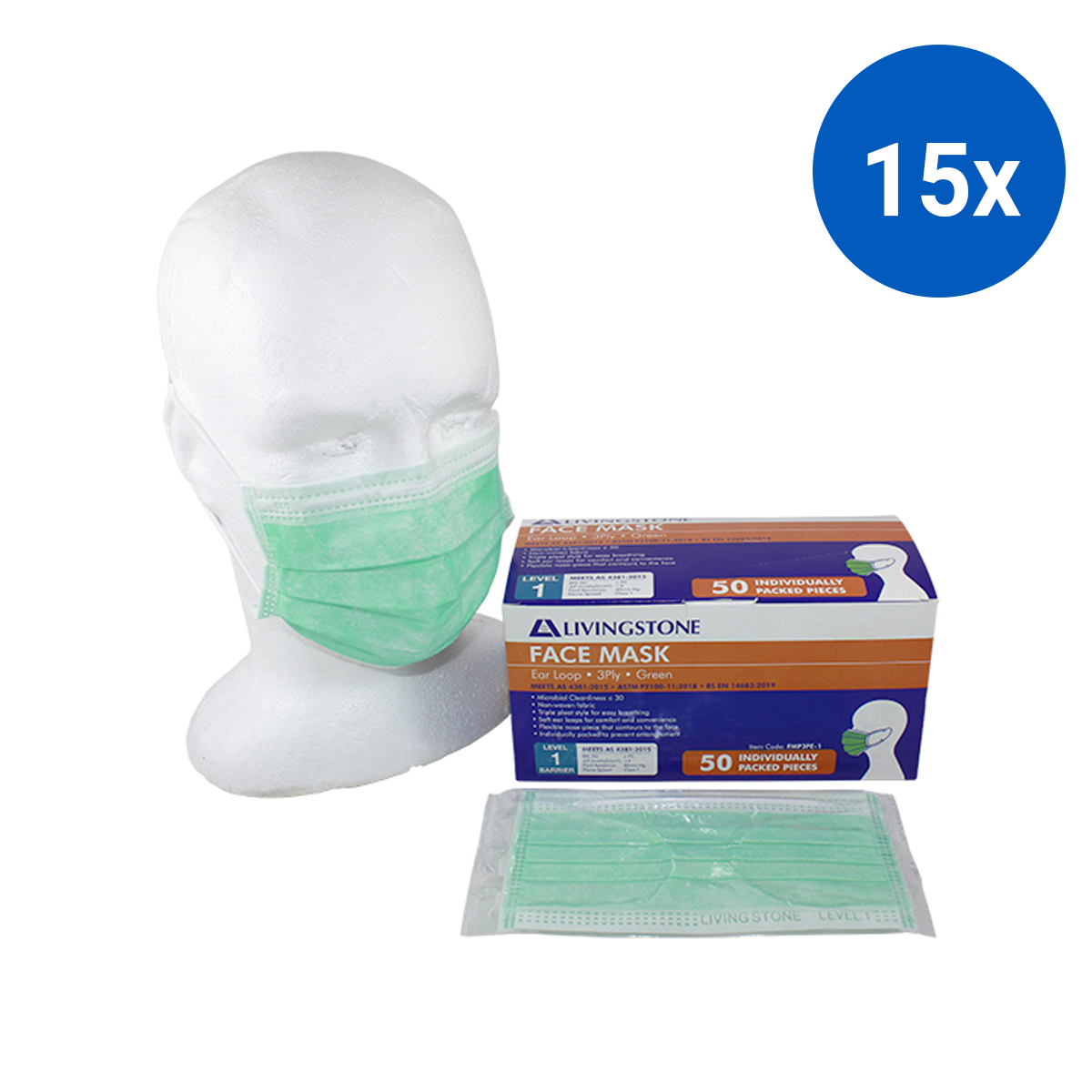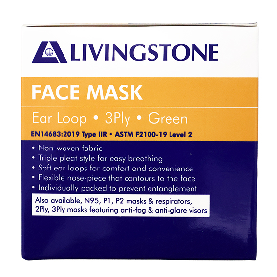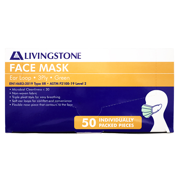 Livingstone Face Mask TGA 350632 Level 2 3-Ply EN14683 Type IIR ASTM F2100-19 Earloop 1 Pc/Pack 50 Packs/Box - Green x15