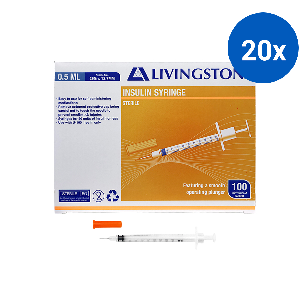 Livingstone Insulin Syringes 0.5ml with Needle 29G x 12.7mm Sterile 100 Pcs/Box - White x20