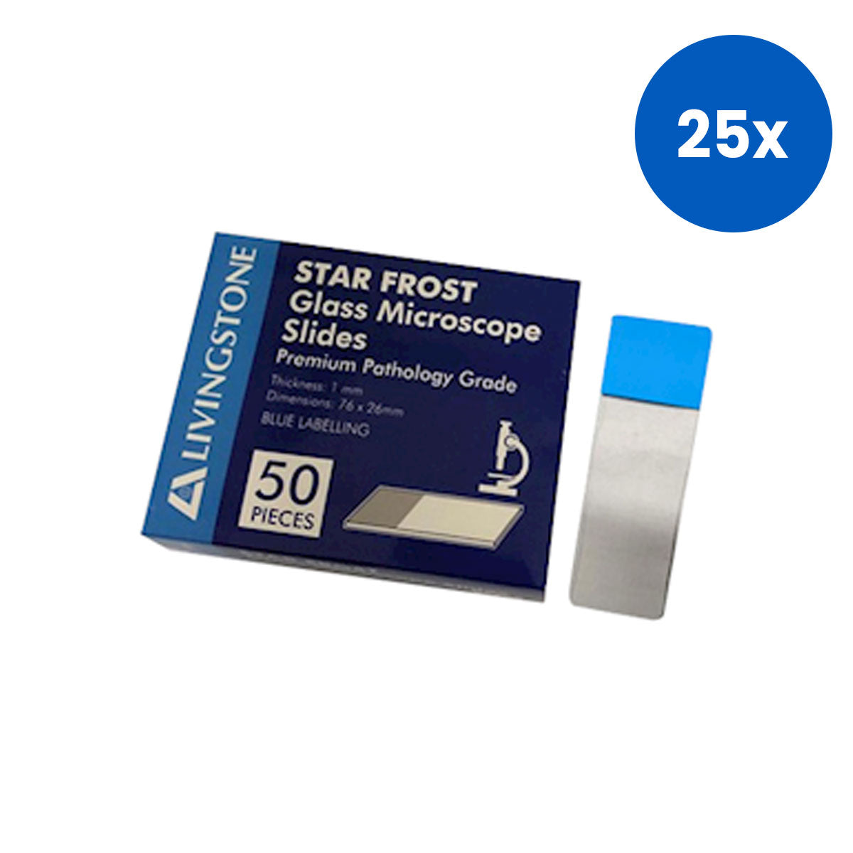 Livingstone Microscope Glass Slide 76 x 26mm with Blue Labelling Panel 50 Slides/Pack - Silver x25