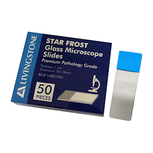Livingstone Microscope Glass Slides are precision-cut laboratory substrates ideal for specimen mounting and microscopic analysis. Each slide measures 76 x 26mm with a 1mm thickness and features ground edges for safe handling and reduced chipping. Designed with a blue enamel-coated panel, the slides allow easy labeling using pencil or ink, improving sample organization and traceability. Made from high-quality European glass, they offer optical clarity and durability essential for clinical, research, and educational environments. Supplied in packs of 50, these slides support efficient use in pathology labs, teaching institutions, and diagnostic facilities.