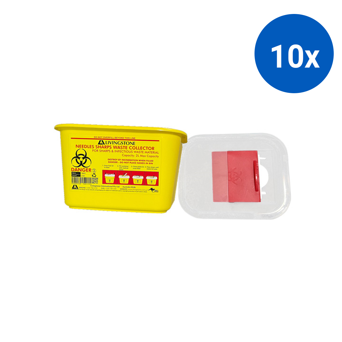 Livingstone Needles Sharps Waste Collector 2L Sliding Safety Lid & Needle Slots Clear View Top 10/Ctn - Yellow x10