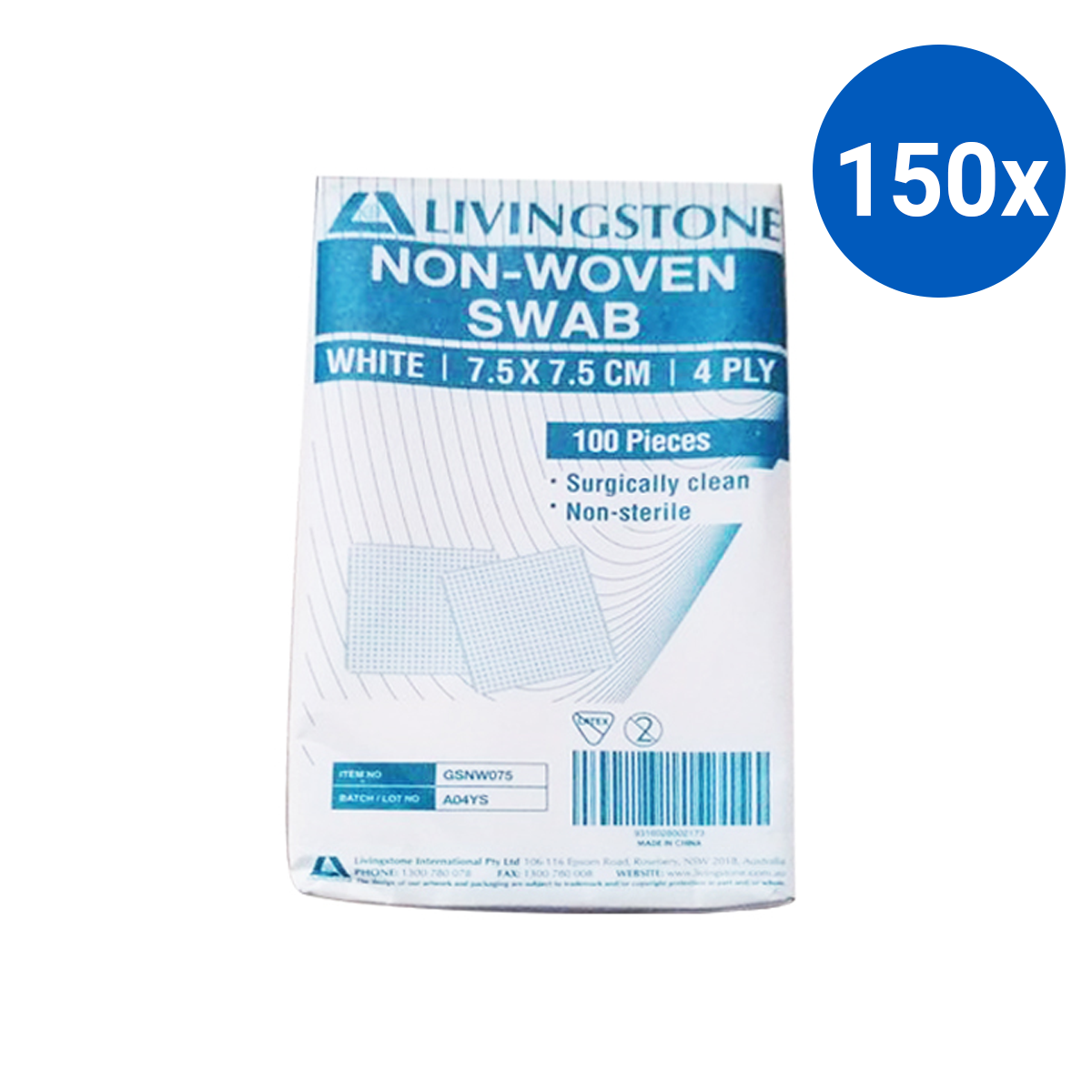 Livingstone Non-Woven Swabs Superior Absorbency 4Ply 7.5 x 7.5cm 100/Pack - White x150