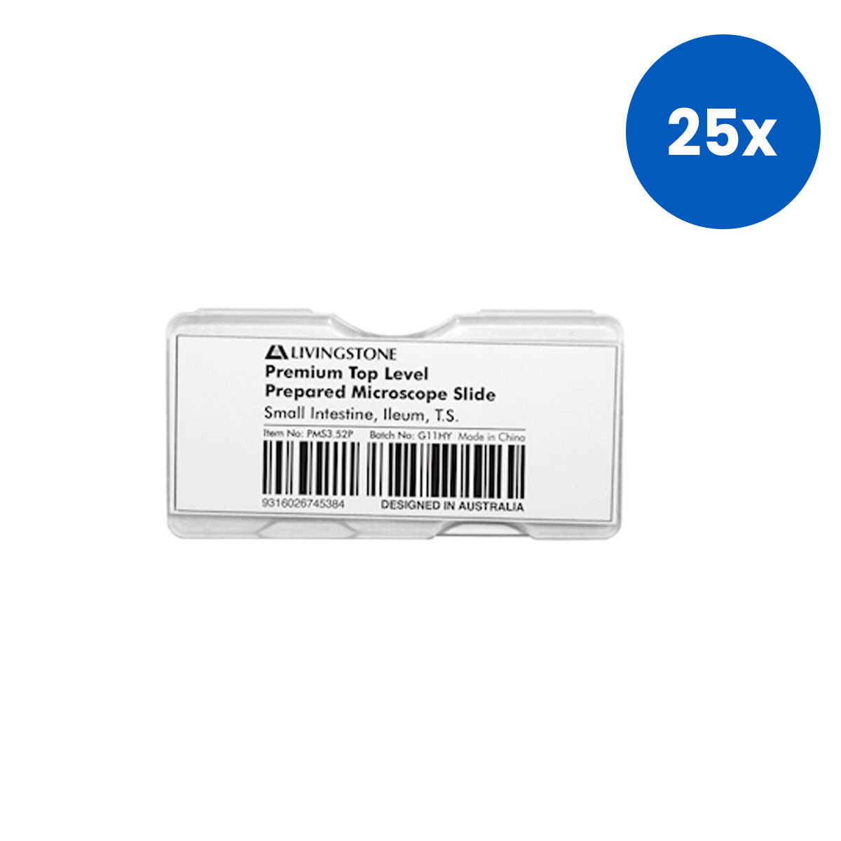 Livingstone Premium Prepared Slide (Item No. PMS3.52P) features a transverse section of the small intestine (ileum), meticulously stained and mounted for educational and laboratory use. This slide highlights the structural composition of the ileum including villi, mucosa, submucosa, muscularis, and serosa layers—ideal for understanding nutrient absorption and intestinal histology in biology instruction or pathology training. The professional-quality glass mounting ensures specimen stability and clarity under brightfield microscopy, offering learners a reliable view of epithelial cells, goblet cells, and lymphatic tissue.