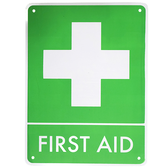 An informative safety sign made from polypropylene that is green, stating (FIRST AID).