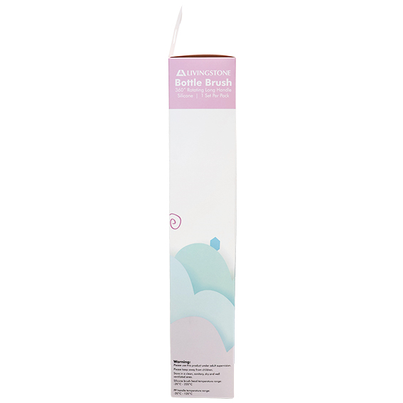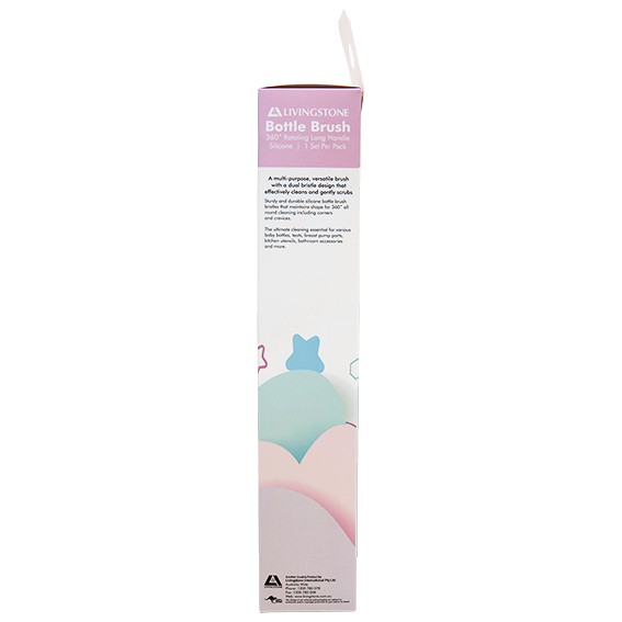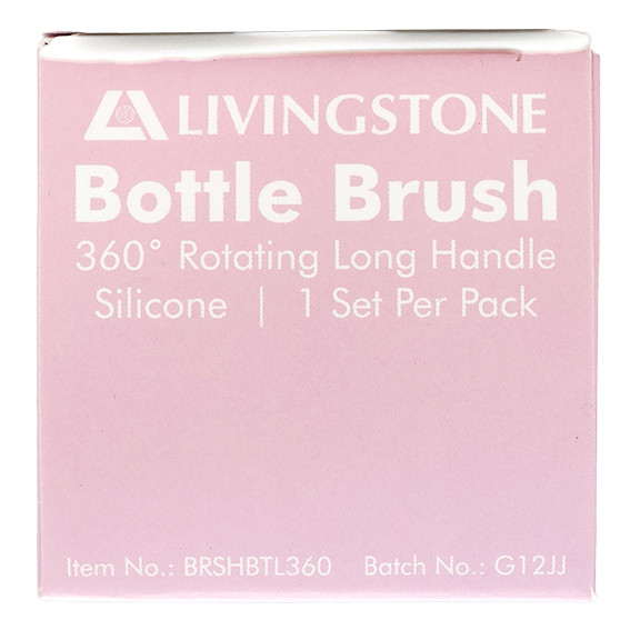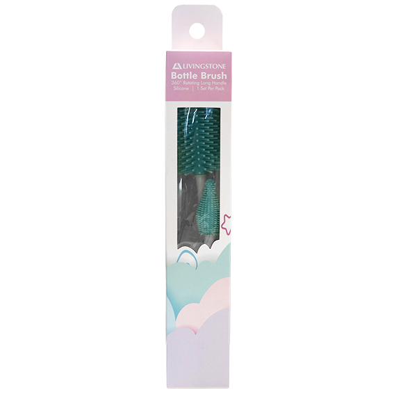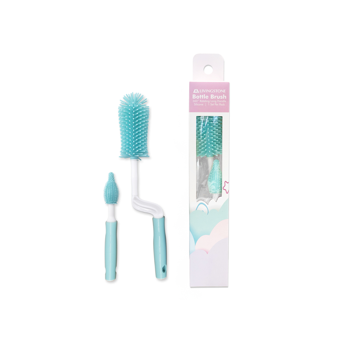 Livingstone Silicone Bristle Bottle and Nipple Brush set has 360 degree upright rotating long handle for easier handling. The handles have round holes for hanging dry. It comes with thicker and more durable silicone bristles that cleans more effectively, and soft enough to prevent scratches on the bottle.