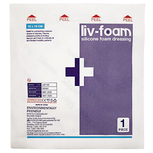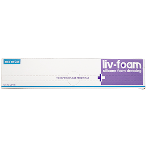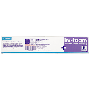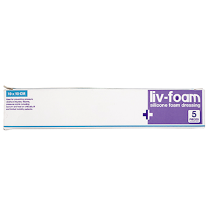Liv-Foam is an absorbent atraumatic dressing made from polyurethane foam. Suitable for use under compression bandaging. Outer surface of the foam is bonded to a air permeable polyurethane membrane which acts as a barrier to liquid and micro pathogens. Self adherent foam minimises pain and trauma at dressing changes, and does not require secondary fixation. Dressing can remain in place for several days depending on the condition of the wound. Dressing can be lifted and adjusted without losing its adherent properties. Water proof, promotes patient comfort during wear. Silicone reduces risk for skin irritation and allergy. Pad Size: 6.5 x 6.3cm