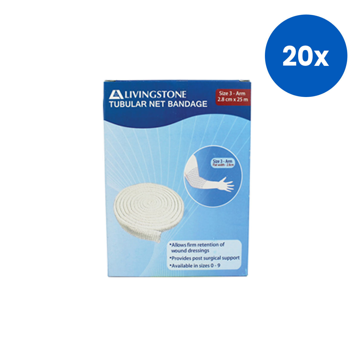 Livingstone Tubular Net Bandage Size D/3 Arm & Elbow 28mm Wide Elastic Retention Wrap 25m 1 Roll/Box – White x20