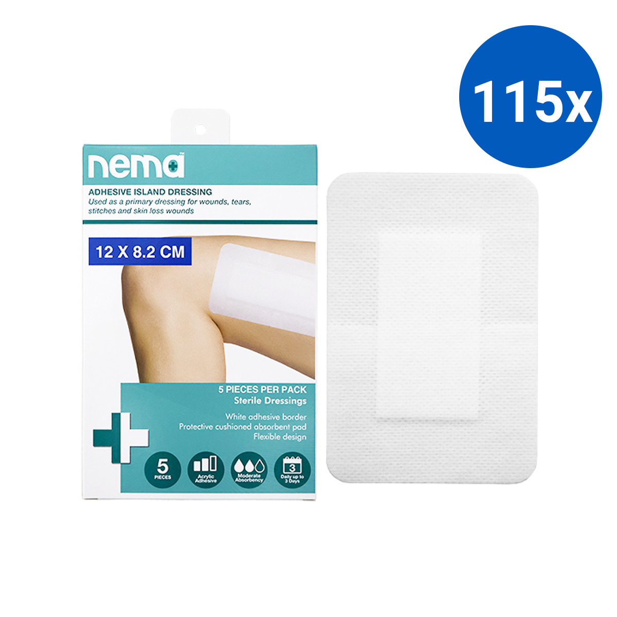 Nema Adhesive Island Dressing 12 x 8.2cm Sterile Non-Adherent Pad Nonwoven 5/Box - White x115