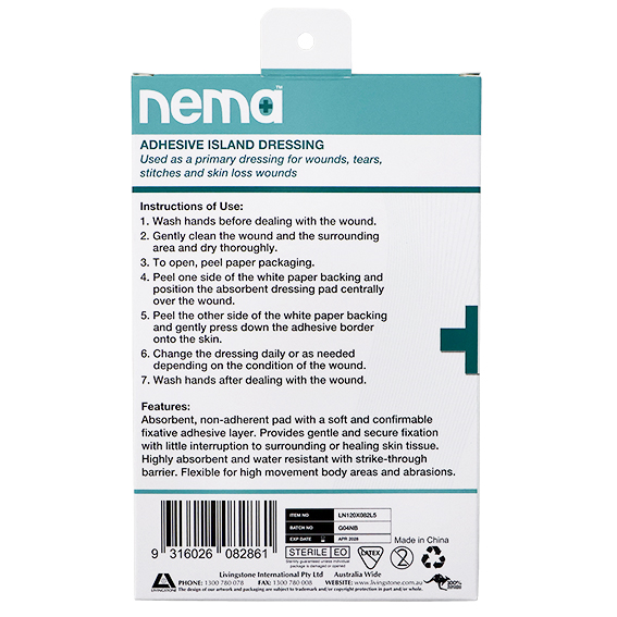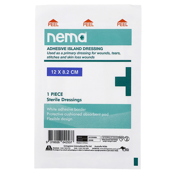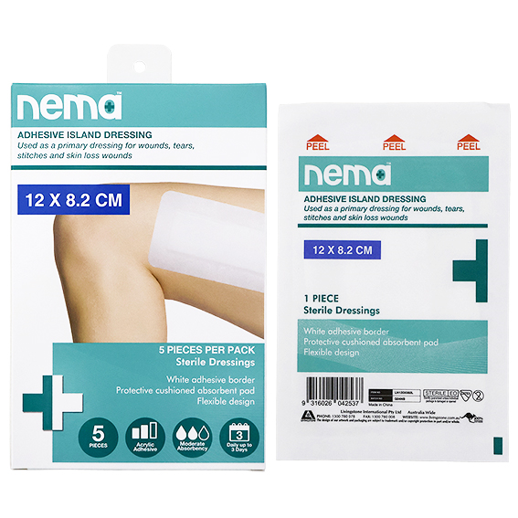 NEMA Island Dressing Sterile Non-Stick With Non-Woven Adhesive Backing 12 x 8.25cm 5 Piece Box. Non-stick wound pad with a non-woven adhesive backing to increase flexibility. Ideal for high movement body areas. Trauma to the underlying tissue is avoided with the inclusion of a non-adherent absorbent pad. Application is easy, simply remove the plastic tabs and apply over the wound.