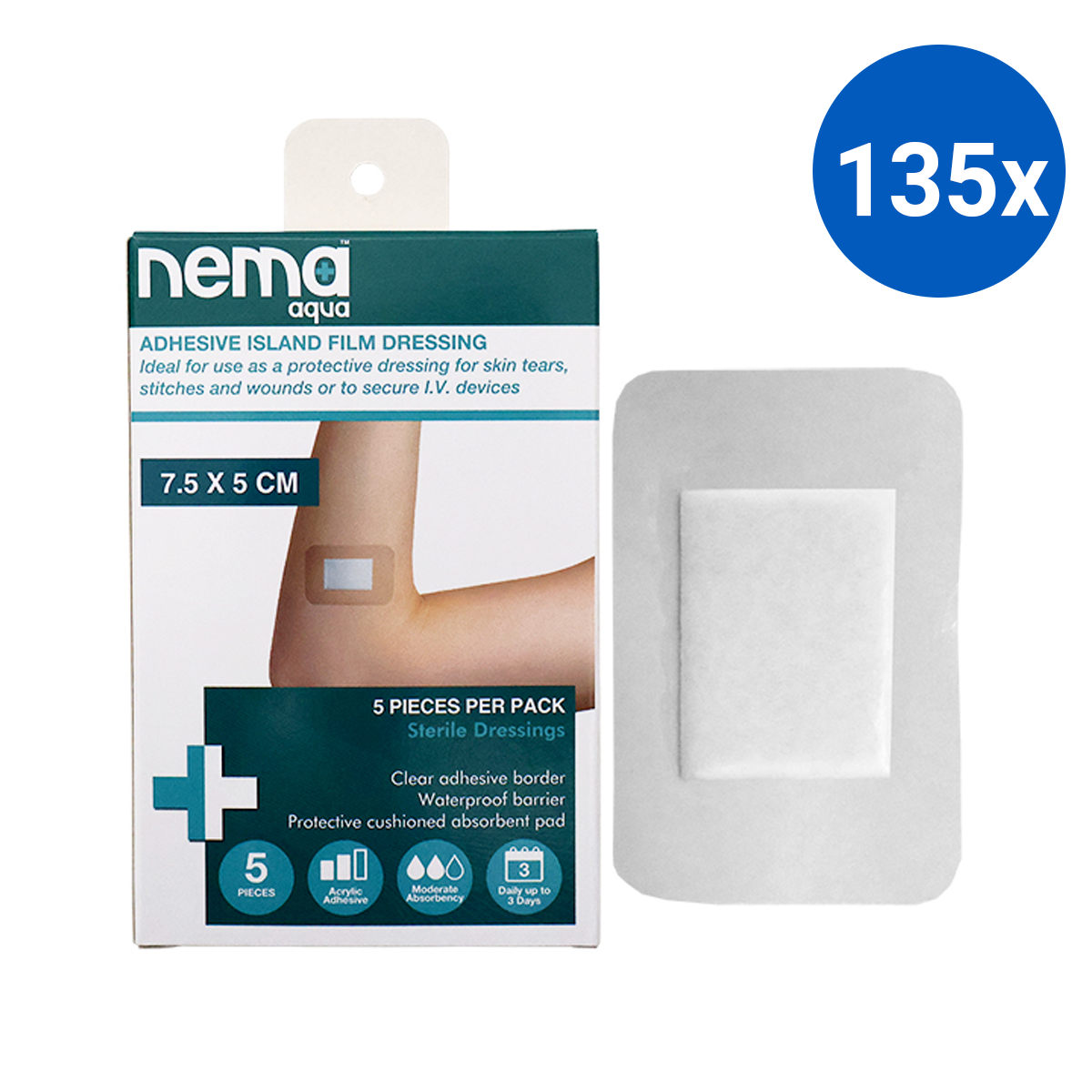 Nema Aqua Island Film Dressing with Non-Adherent Pad 7.5 x 5cm Sterile 5/Pack - Clear x135