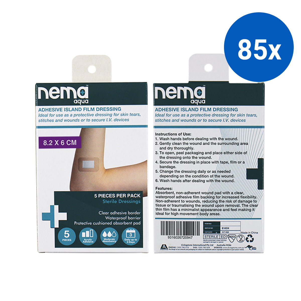 Nema Aqua Transparent Island Film Dressing with Non-Adherent Pad 8.2 x 6cm Sterile 5/Pack - Clear x85