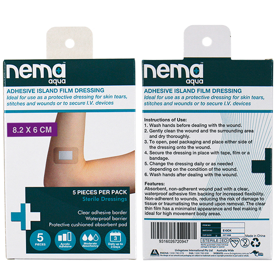 Nema Aqua Adhesive Island Film Dressing is a clear dressing that is completely waterproof. The clear thin film has a minimalist appearance and feel. It comes with a highly absorbent Non-Adherent and non-sticking pad to keep wounds dry. Available in various sizes to suit.