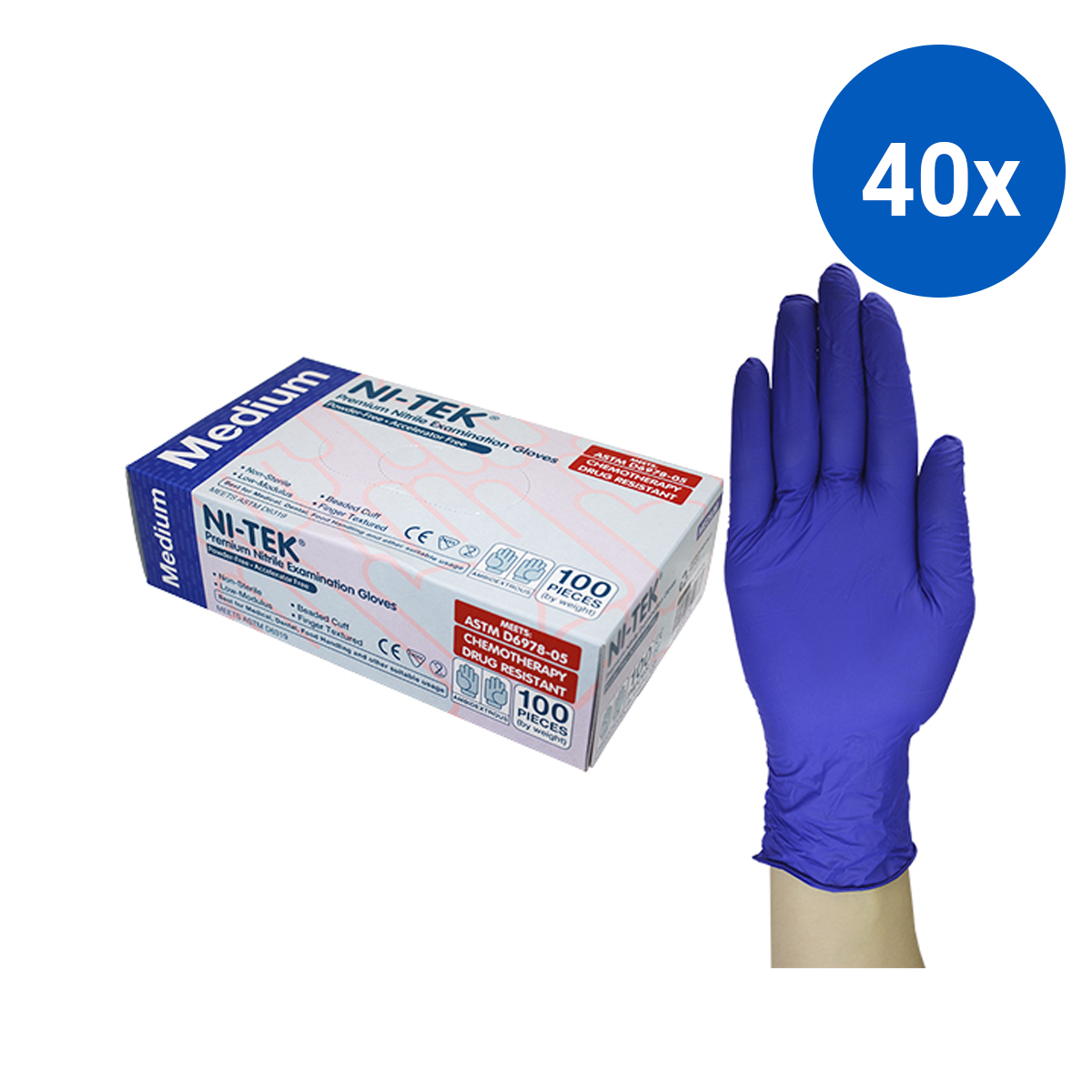 Ni-Tek Nitrile Accelerator Free Gloves ASTM Powder Free EN374 Medium 100/Box - Blueple x40