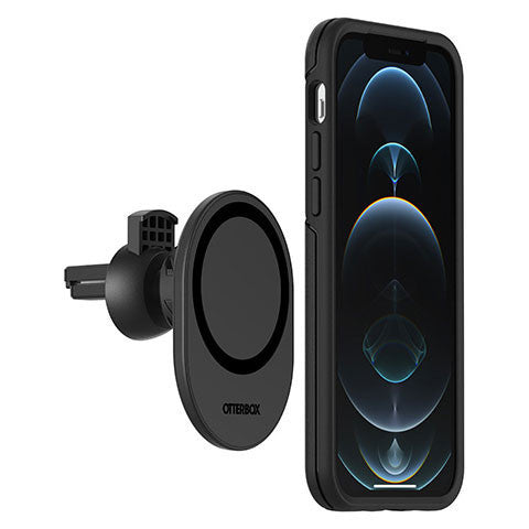 OtterBox MagSafe Vent Mount - Black supports your iPhone on the drive. Car Vent Mount is a handy addition to your OtterBox case or phone that works with Apple MagSafe technology. The easily adjustable mount clicks your phone into place and holds it securely wherever the road takes you.
