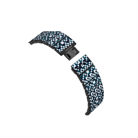 Pitaka Dreamland Chromacarbon Watch Band Apple Watch Series 1-9/SE/Ultra 2/Ultra - Mosaic Inspired by the intricate structure and boundless imagination of architectural art, particularly these two highly dreamlike examples of modernist architecture, we take their iconic design elements mosaic and staircase to create a spiritual space to explore the realm of dreams and our inner mind. ChromaCarbon is a revolutionary composite lamination technology that seamlessly blends the strength of carbon fiber with the resilience of aramid fiber. This unique process involves a special resin, meticulously treated at high temperatures and pressures, ensuring unparalleled durability and toughness across diverse materials. Adding to its allure, the proprietary Fusion Weaving technique adorns black carbon fiber with mesmerizing pixelated hues of aramid fiber.