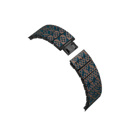 Pitaka Dreamland Chromacarbon Watch Band Apple Watch Series 1-9/SE/Ultra 2/Ultra - Stairs Inspired by the intricate structure and boundless imagination of architectural art, particularly these two highly dreamlike examples of modernist architecture, we take their iconic design elements mosaic and staircase to create a spiritual space to explore the realm of dreams and our inner mind. ChromaCarbon is a revolutionary composite lamination technology that seamlessly blends the strength of carbon fiber with the resilience of aramid fiber. This unique process involves a special resin, meticulously treated at high temperatures and pressures, ensuring unparalleled durability and toughness across diverse materials. Adding to its allure, the proprietary Fusion Weaving technique adorns black carbon fiber with mesmerizing pixelated hues of aramid fiber.