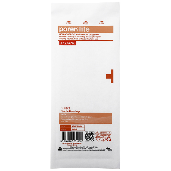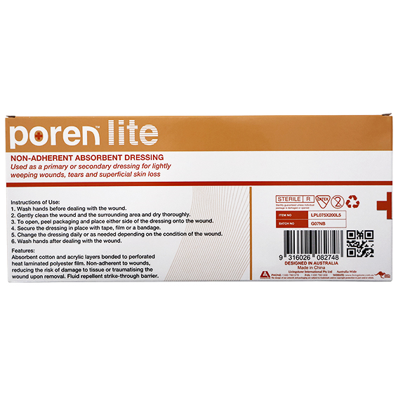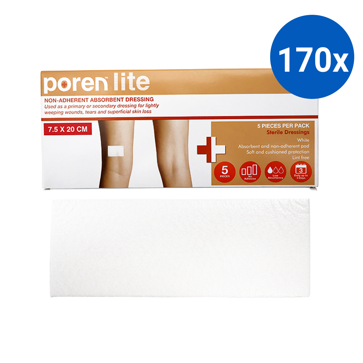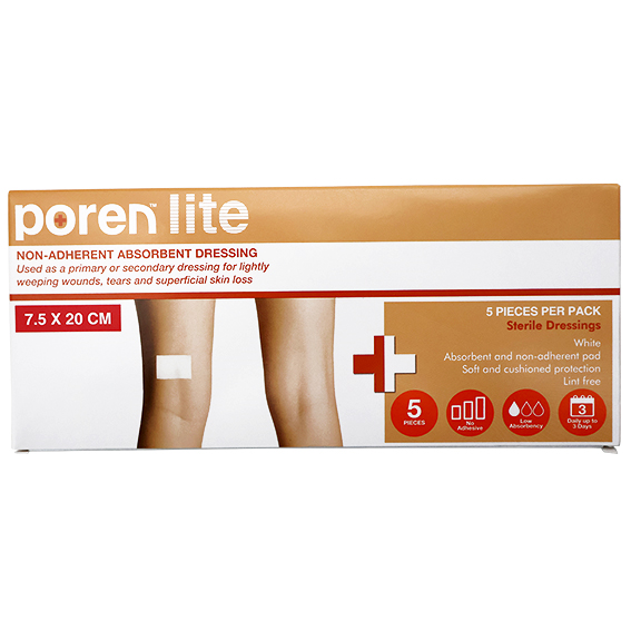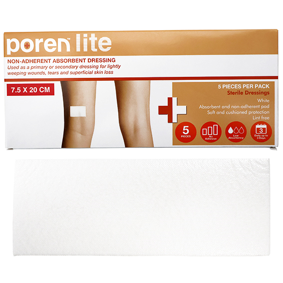 Poren Lite Non-Adherent Dressing Cotton and Acrylic Bonded Non-Linting 7.5 x 200cm 5 Piece Box. Non-adherent wound pad. Made of cotton and acrylic bonded to perforated polyester film. Non-linting. Can be applied directly to wound. Recommended for skin tears and superficial skin loss wounds.