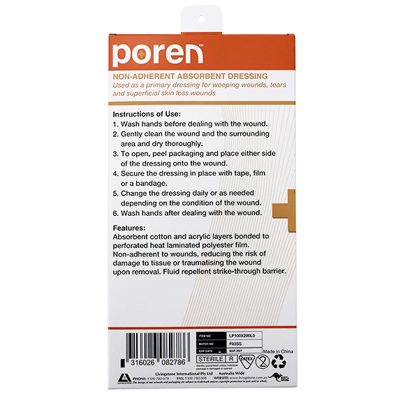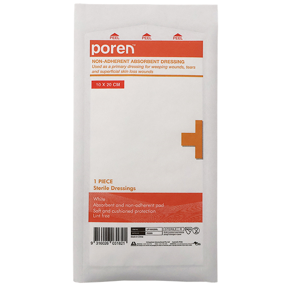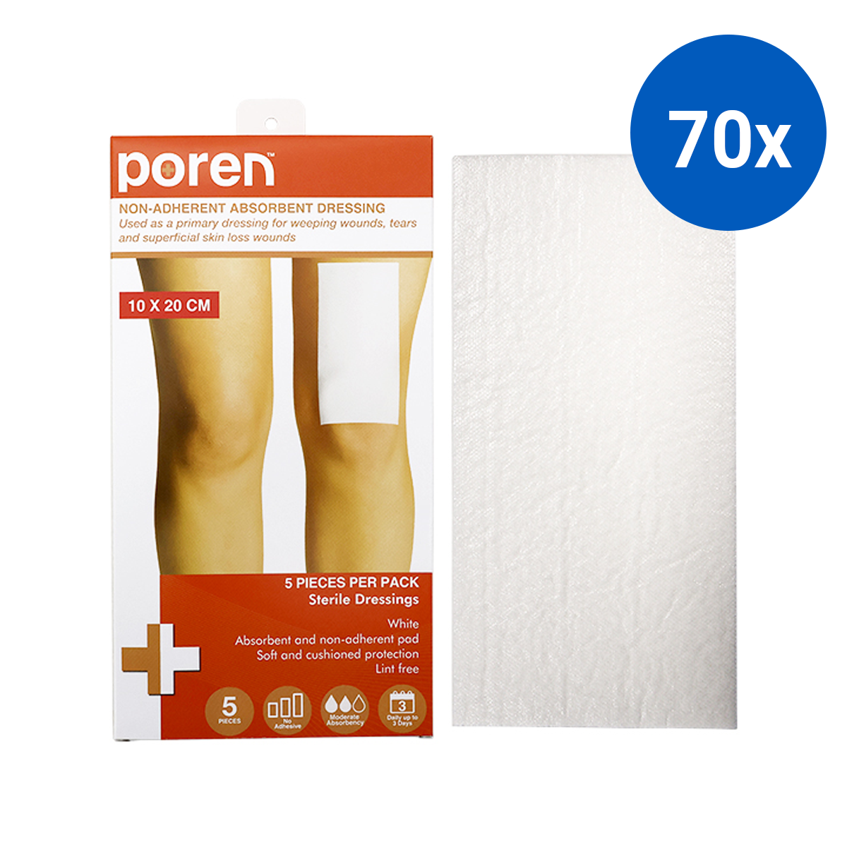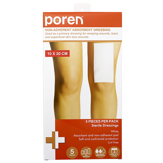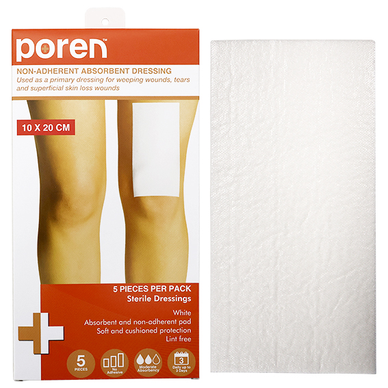 Poren Non-Adherent Dressing Cotton and Acrylic Bonded Non-Linting 10 x 20cm 5 Piece Box. Non-adherent wound pad. Made of cotton and acrylic bonded to perforated polyester film. Non-linting. Can be applied directly to wound. Recommended as a secondary dressing.