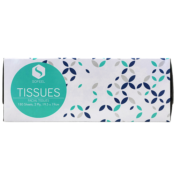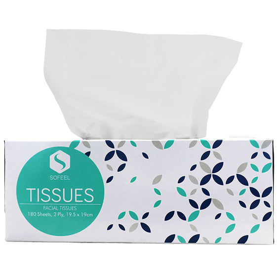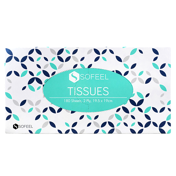 Sofeel Executive Facial Tissues is soft on the skin and face with great strength and absorbency. Features include: Soft Tissue 2 Ply, White, attractive package design and no waste starter sheet. Unit: 180 Sheets/Box.