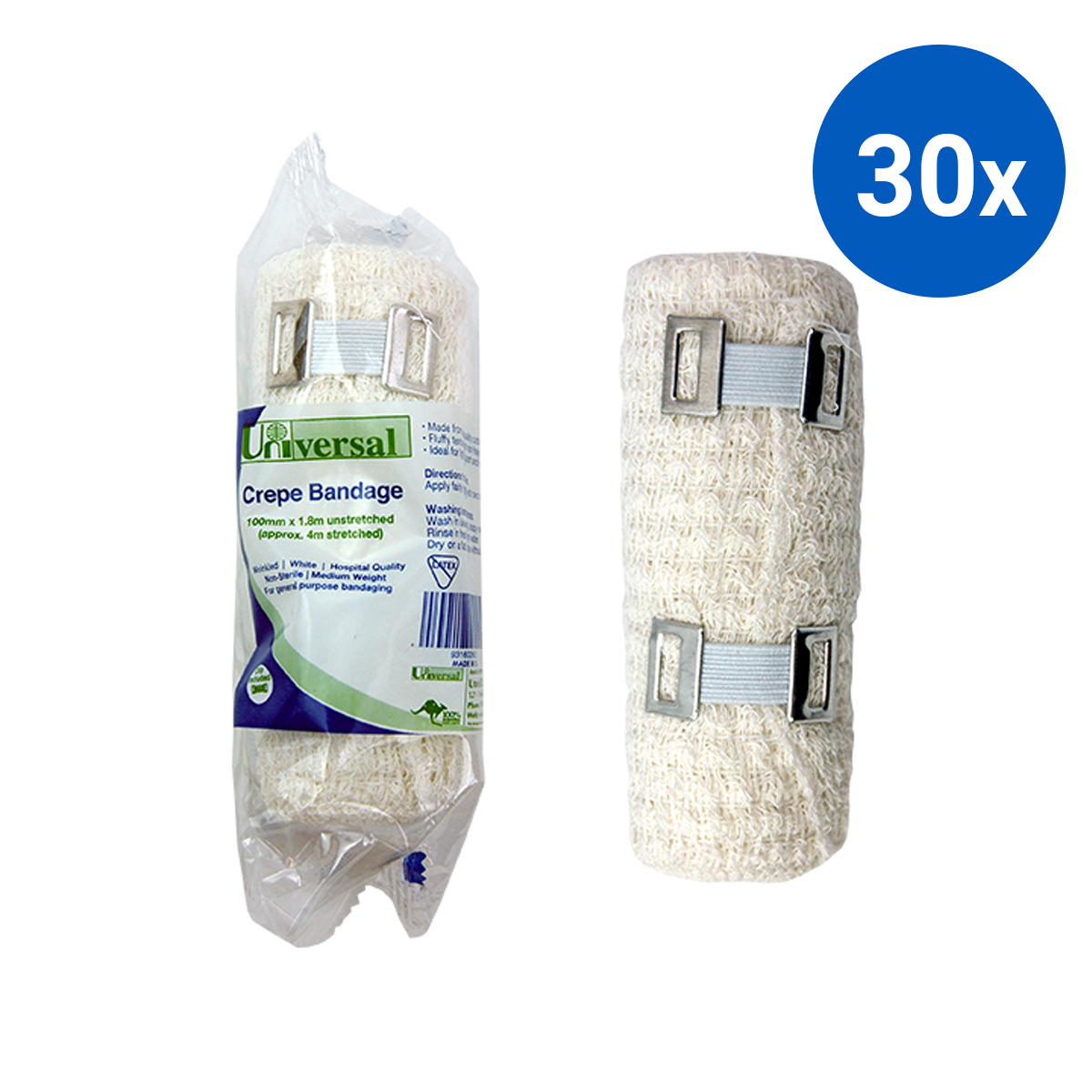 Universal Crepe Bandage 10cm x 1.8m Unstretched 4m Stretched 12/Pack - White x30