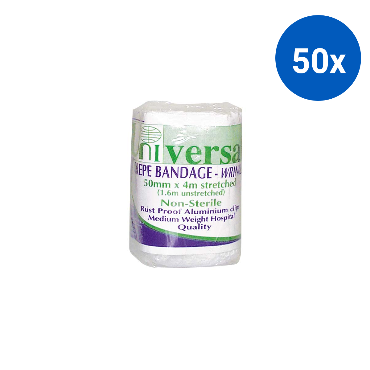 Universal Crepe Bandage 5cm x 1.6m Unstretched 4m Stretched 12/pack - White x50