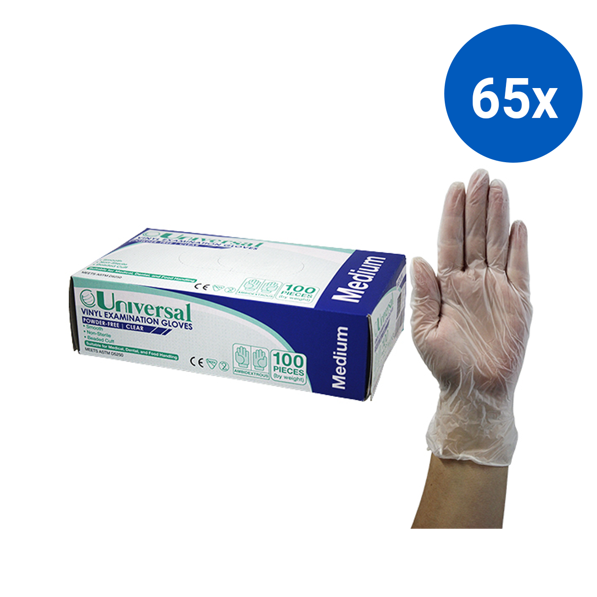 Universal Vinyl Examination Gloves Recyclable 6.0g TGA 304988 ASTM Powder Free Medium 100/Box - Clear x65